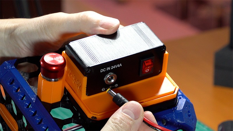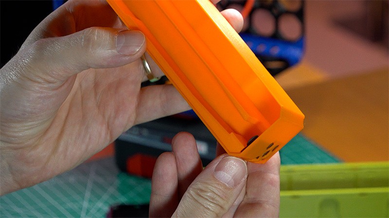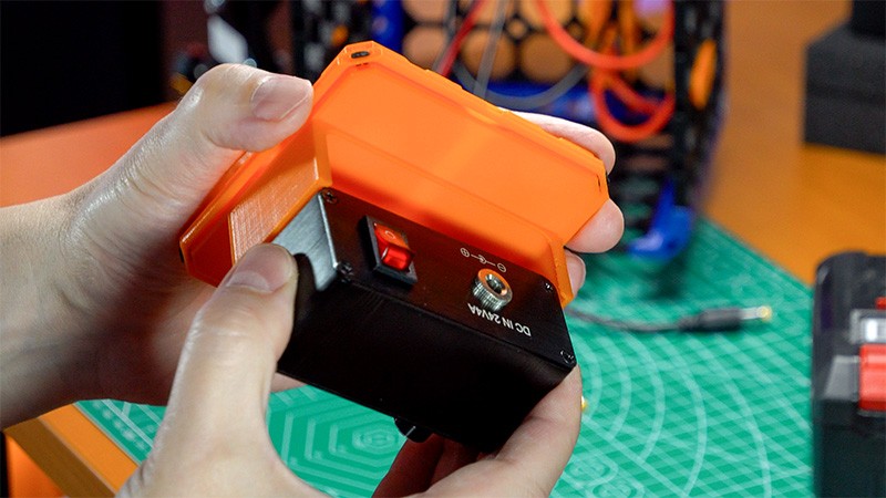 Da der Akku einen perfekten Schwerpunkt bildet, nutze ich ihn gleichzeitig als Basis für den gesamten Aufbau. Dafür habe ich für den gekauften Einhell-Adapter einen speziellen Multiboard-Konnektor entworfen und 3D-gedruckt. Dieser wird mit M4 x 8 Schrauben und Muttern sicher befestigt.